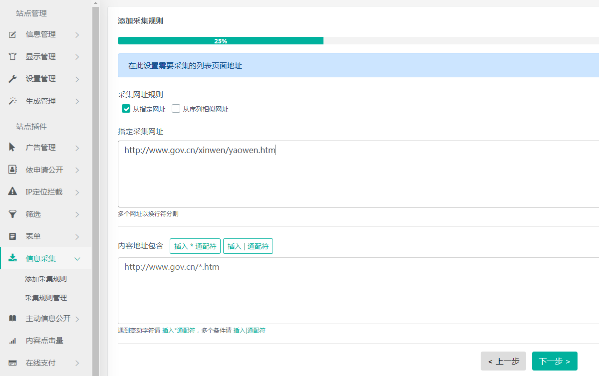 内容地址包含 用于过滤采集的内容地址,系统将从列表页中选择指定格式的地址作为内容页面的链接。如上图所示,系统仅采集包含http://www.gov.cn/*.htm字符串的内容页面,其中*代表任意字符。