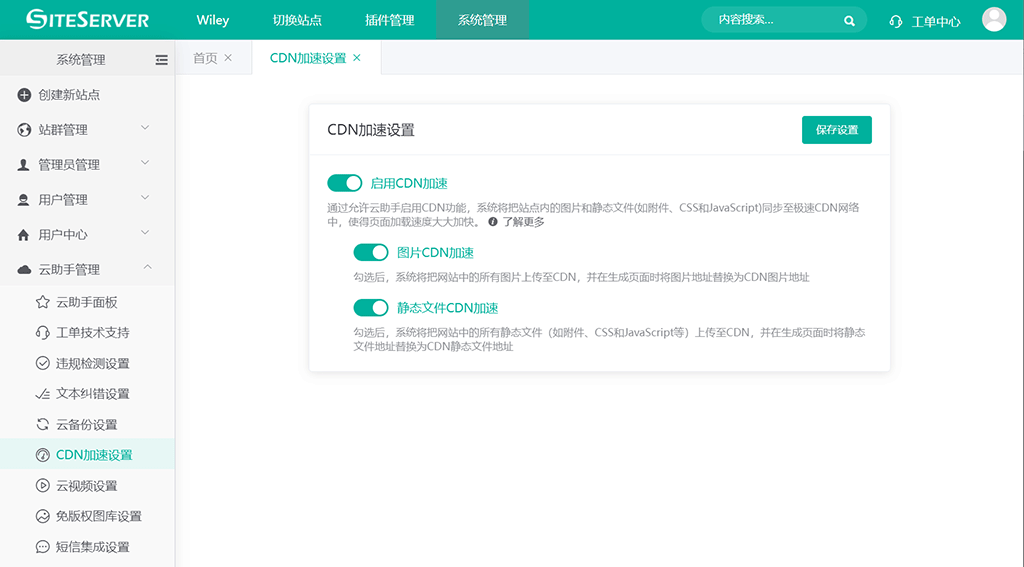 使用CDN加速前需要在云助手管理中启用CDN加速功能,同时可以根据需要设置CDN加速选项: