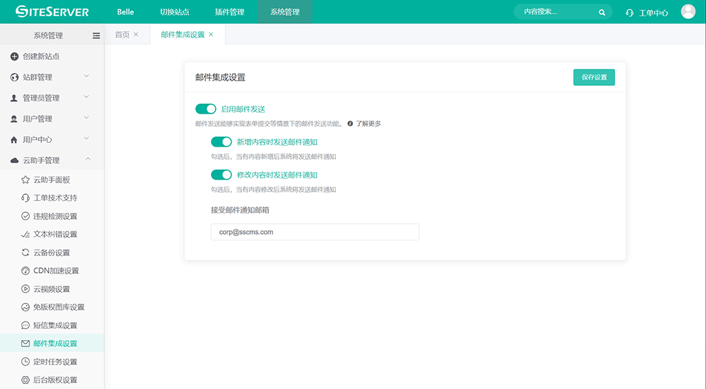 使用邮件发送前需要在云助手管理中启用邮件发送功能,同时可以根据需要设置邮件发送选项: