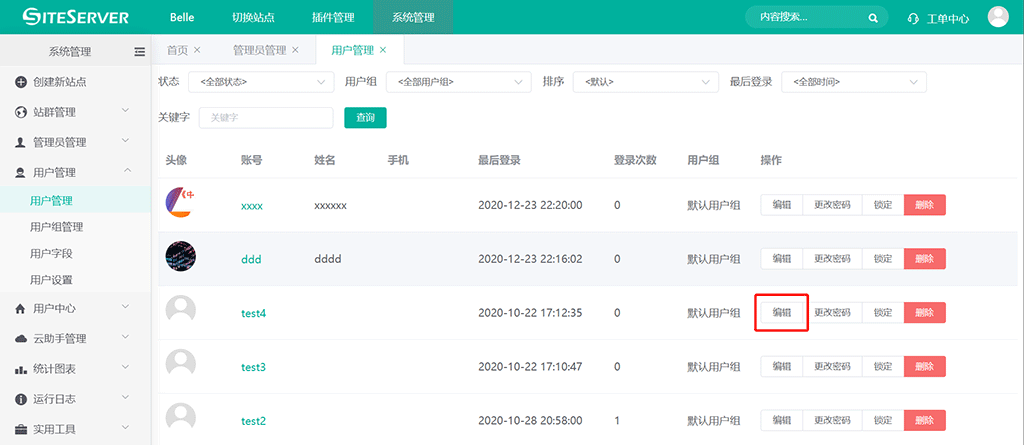 勾选 用户中心启用短信验证 选项后,我们需要进入 用户管理 界面: