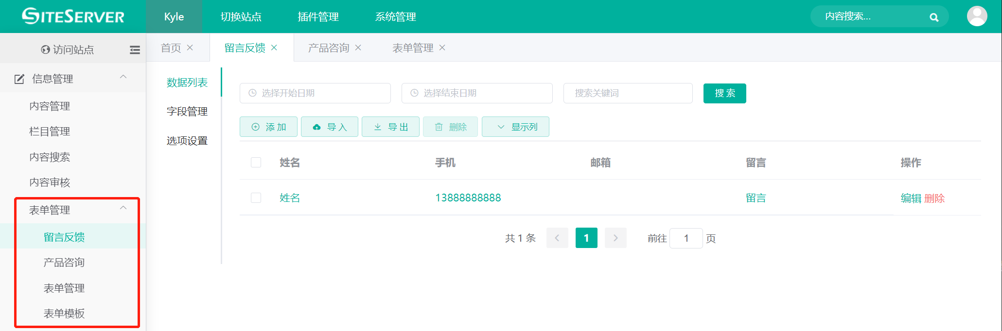 每个表单均有独立的管理界面,进入 SSCMS 管理界面,在左侧的 表单管理 下拉菜单中点击需要管理的表单名称,进入表单管理界面: