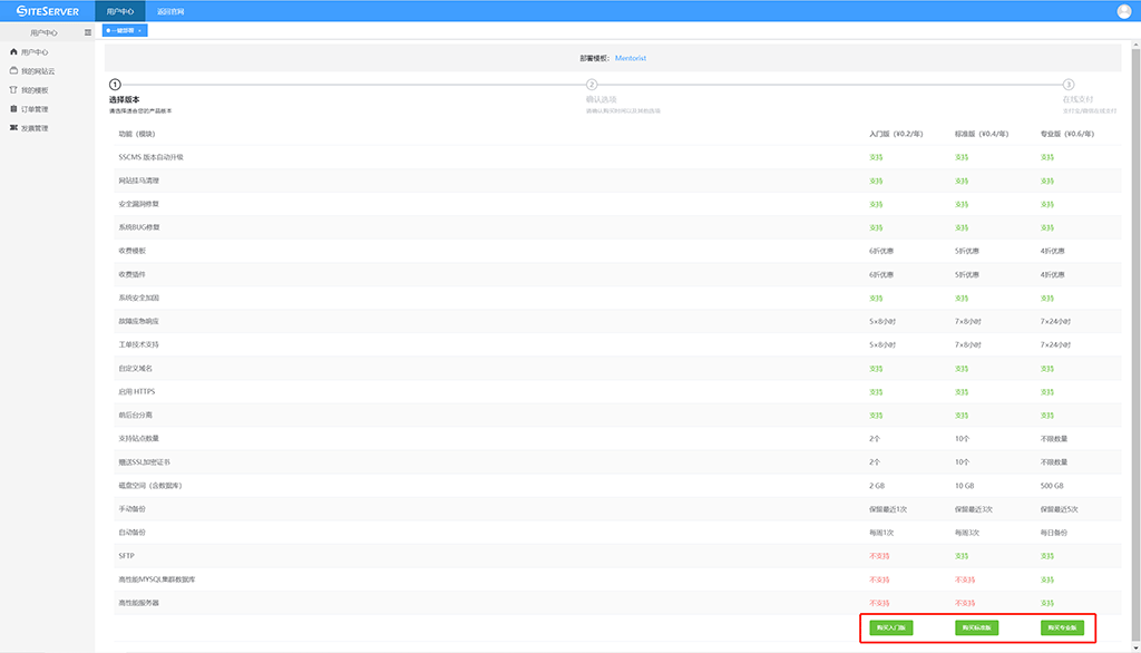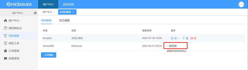 我们找到第二步上传的模板,点击右侧 部署 -> 一键部署 按钮,页面将跳转至用户中心 一键部署 界面,在此,我们需要为我们的网站选择网站云版本: