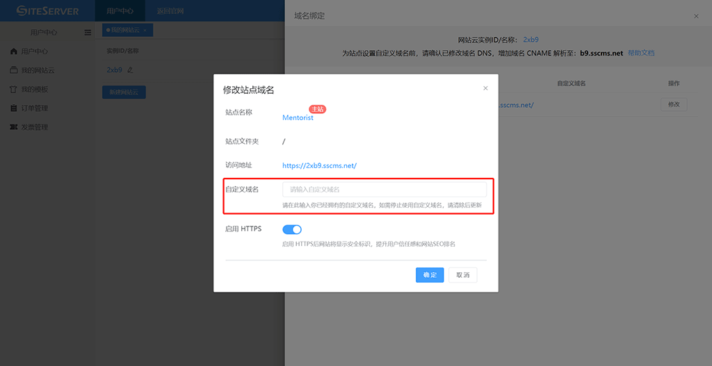 添加完毕域名 CNAME 解析后,在域名绑定界面点击 修改 按钮,弹出修改站点域名界面: