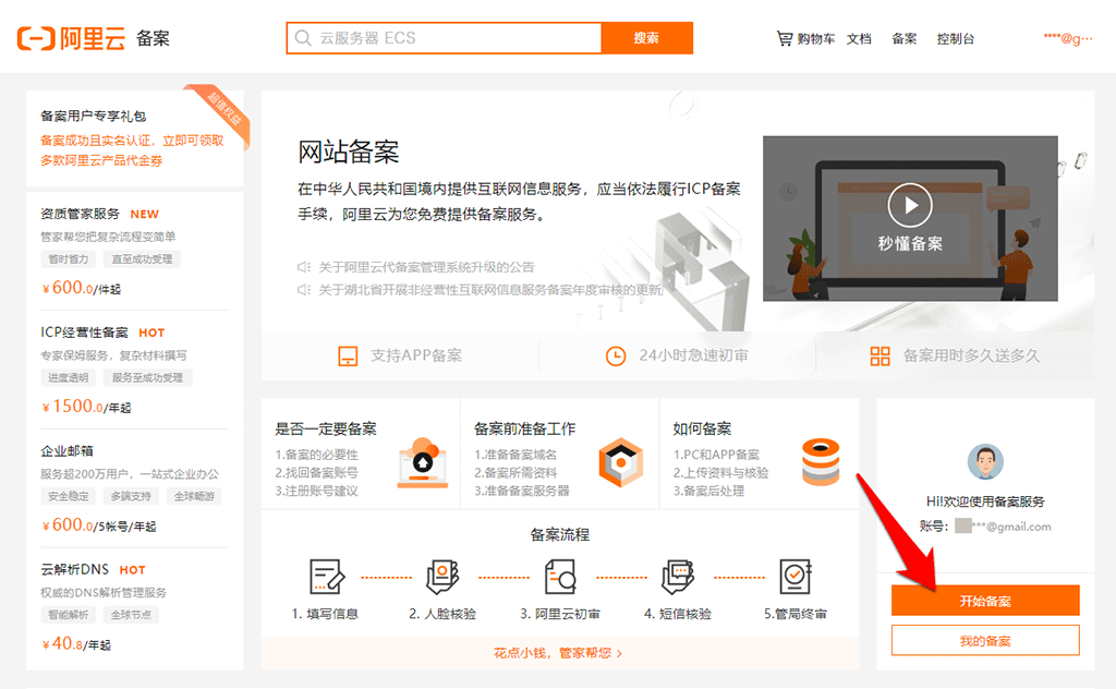 - 登录阿里云备案系统 (opens new window),点击右边的【开始备案】。
