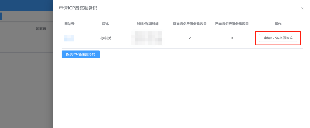 如果您还未购买网站云,无法申请免费服务码,可以点击 购买ICP备案服务码 按钮付费购买ICP备案服务码。