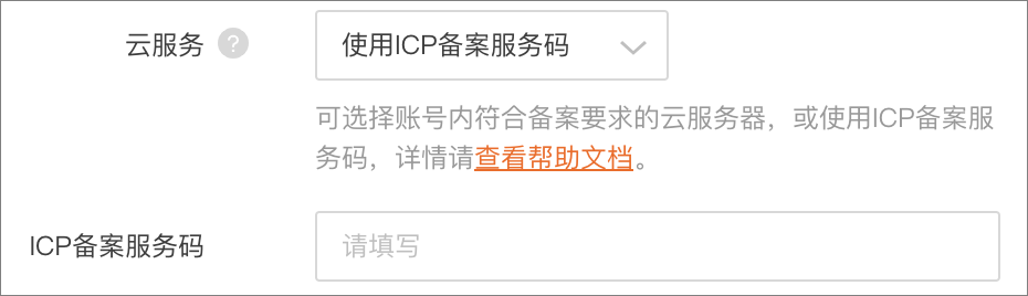 在阿里云备案界面中,我们需要将云服务设置为 使用ICP备案服务 并将获取到的服务码填写到输入框中。