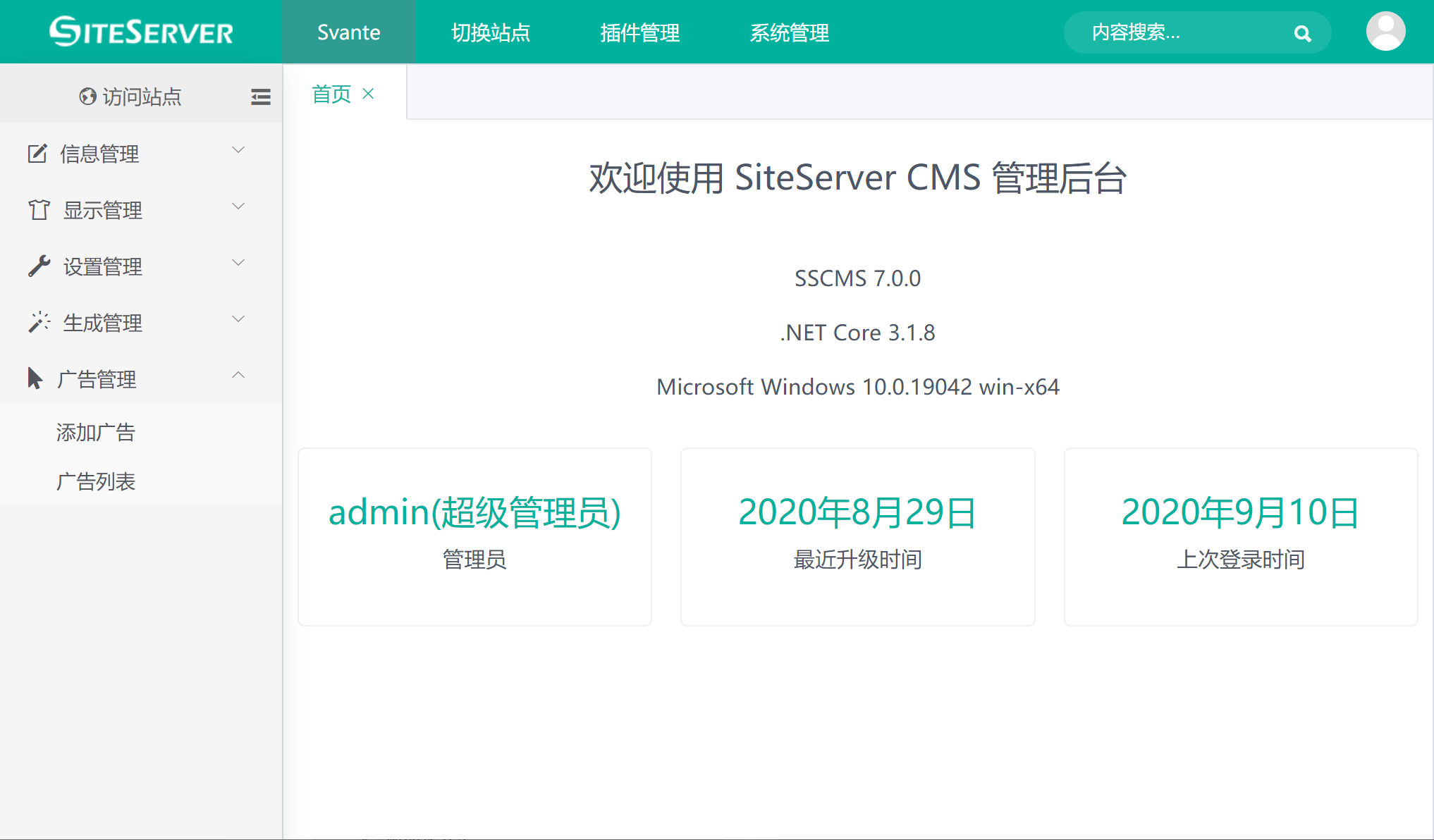 可以访问插件主页 https://sscms.com/plugins/plugin.html?id=sscms.advertisement (opens new window) 获取插件详细信息。