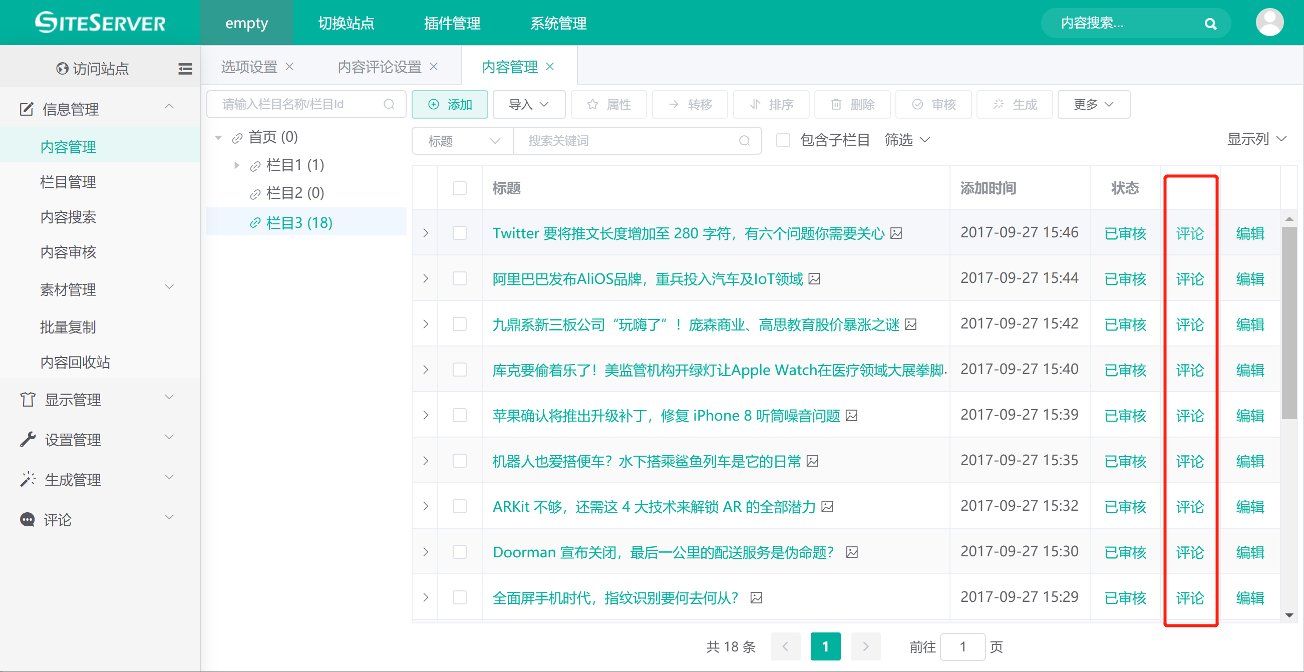 可以选择为所有栏目开启插件,或者为指定栏目开启插件,开启后进入内容管理界面,将能看到内容列表右侧增加了 评论 链接: