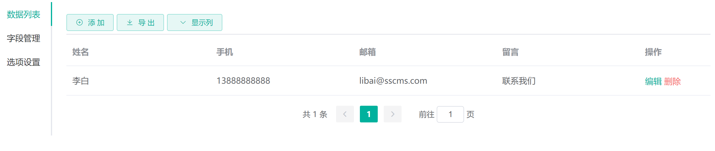 数据列表是表单数据的管理界面,在此可以对表单数据进行新增、修改、删除以及导出等操作。