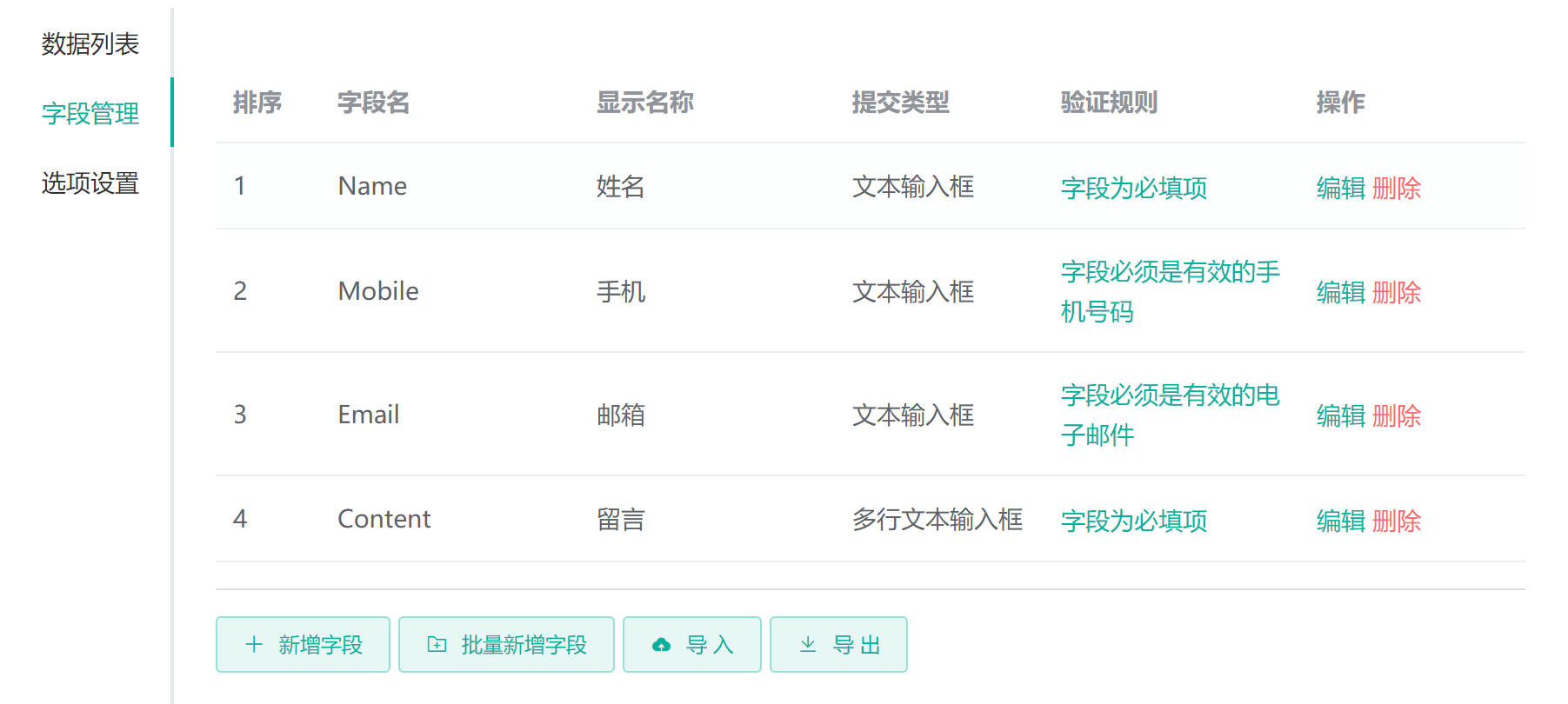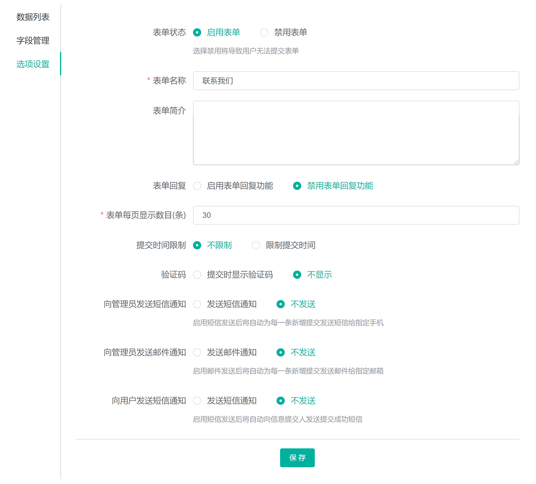 在表单管理界面中,左侧可以切换数据列表、字段管理与选项设置,下面我们分别进行说明: