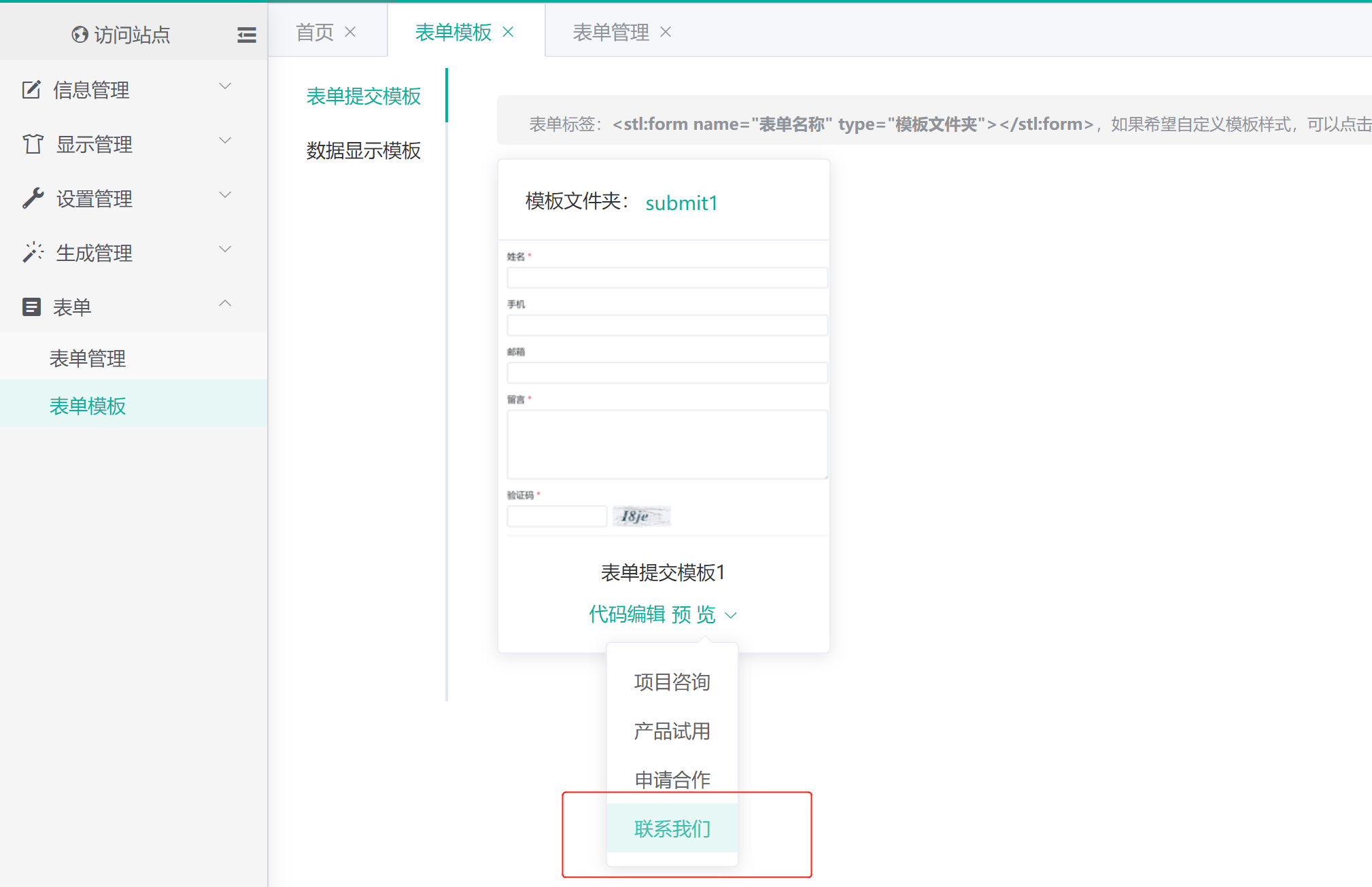 其中 <stl:form> 标签用于显示表单提交界面,name 属性指定表单名称,type 属性指定表单提交样式。