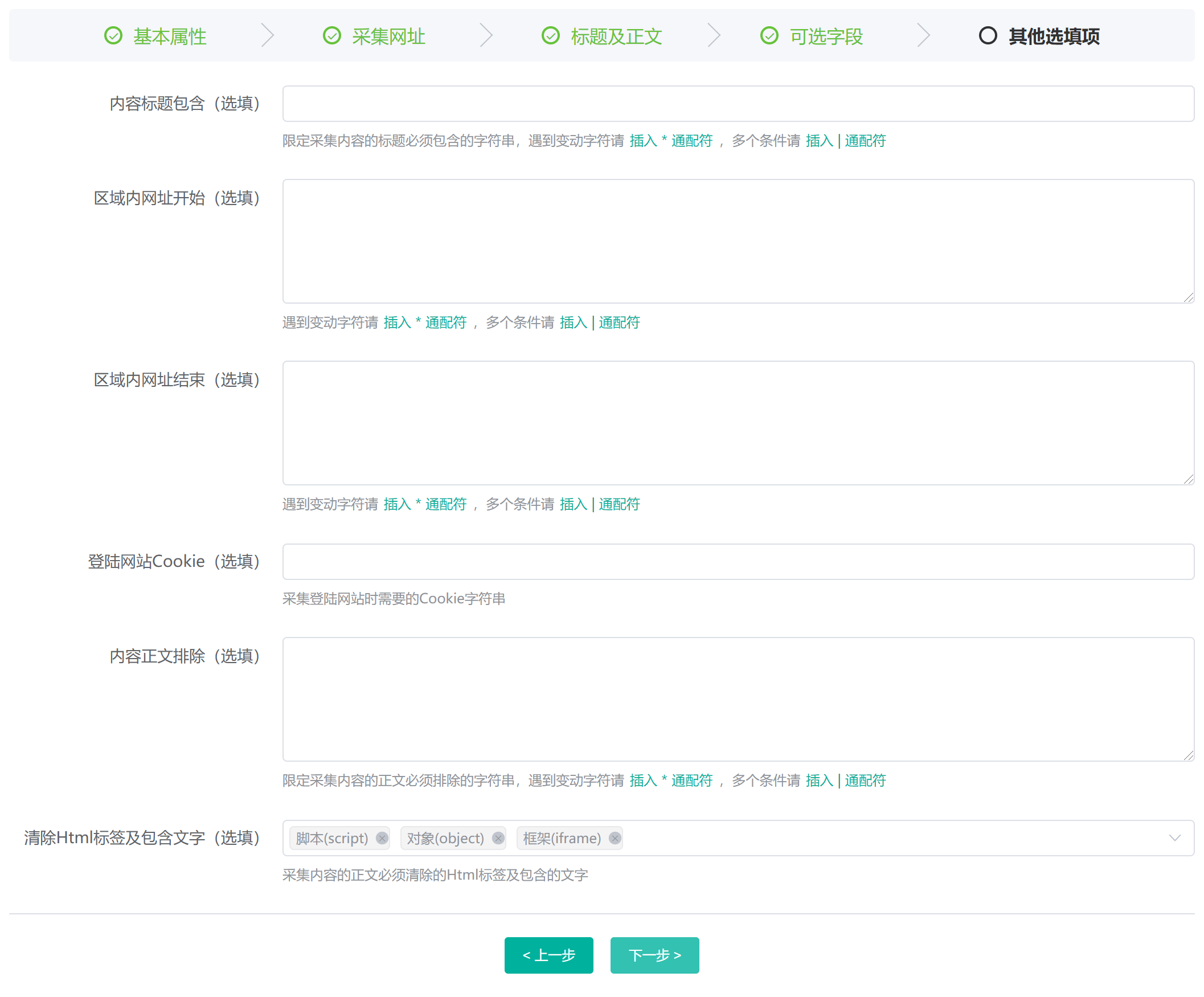 与标题及正文设置类似,需要我们填写采集内容页面 HTML 代码中对应字段的开始及结束代码。