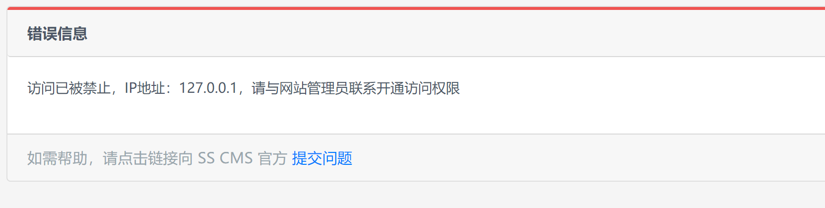 SSCMS 将判断当前访问后台的域名以及当前机器的IP地址,如果出现不匹配的情况,系统将显示如下界面: