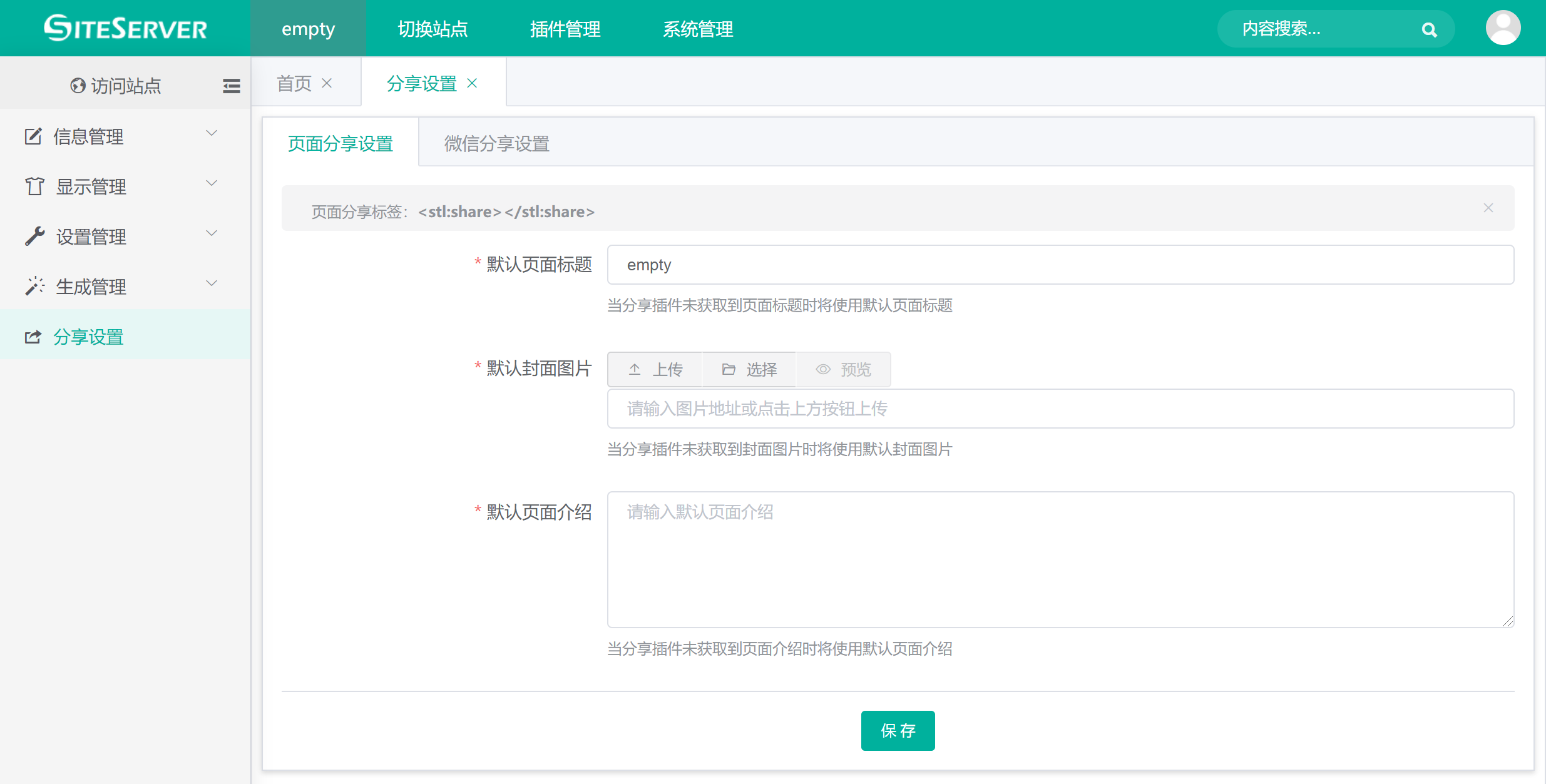 页面分享设置用于设置当分享标签未获取到标题、封面或者简介时使用的文字及图片信息。