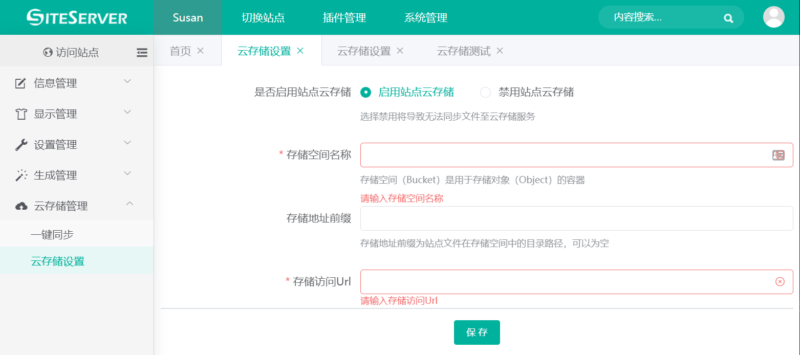 每个站点均有独立的云存储管理界面,进入 SSCMS 站点,点击 云存储管理 -> 云存储设置 菜单,进入云存储的站点设置界面: