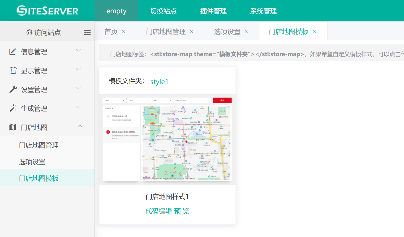 登录插件安装好之后,进入插件管理,左侧菜单下将出现门店地图插件管理菜单,如下图所示: