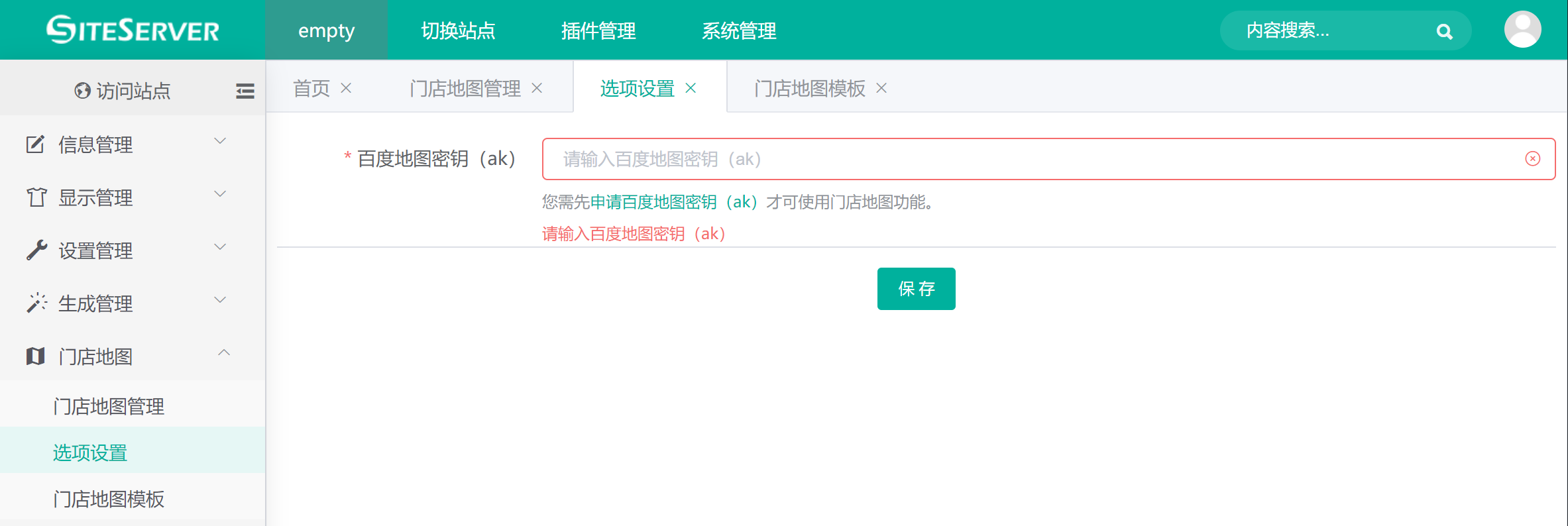 完成百度地图密钥(ak)申请后,就可以进入门店地图插件进行选项设置了,设置完毕参数后门店地图插件才能够正常工作。