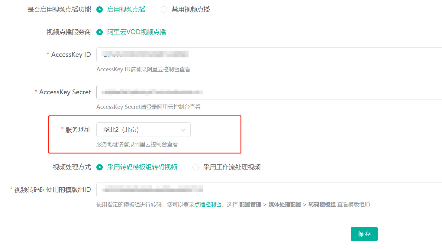 接下来,我们进入视频点播设置界面,将服务地址设置为阿里云开通的区域(例如选择华北2(北京)):