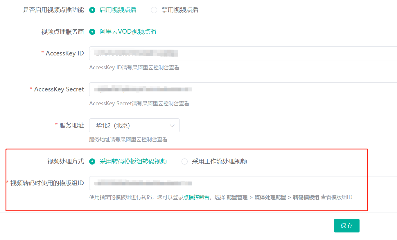接下来,我们进入视频点播设置界面,将视频处理方式设置为采用转码模板组转码视频并将视频转码时使用的模版组ID设置为阿里云控制台中添加转码模版组的ID值: