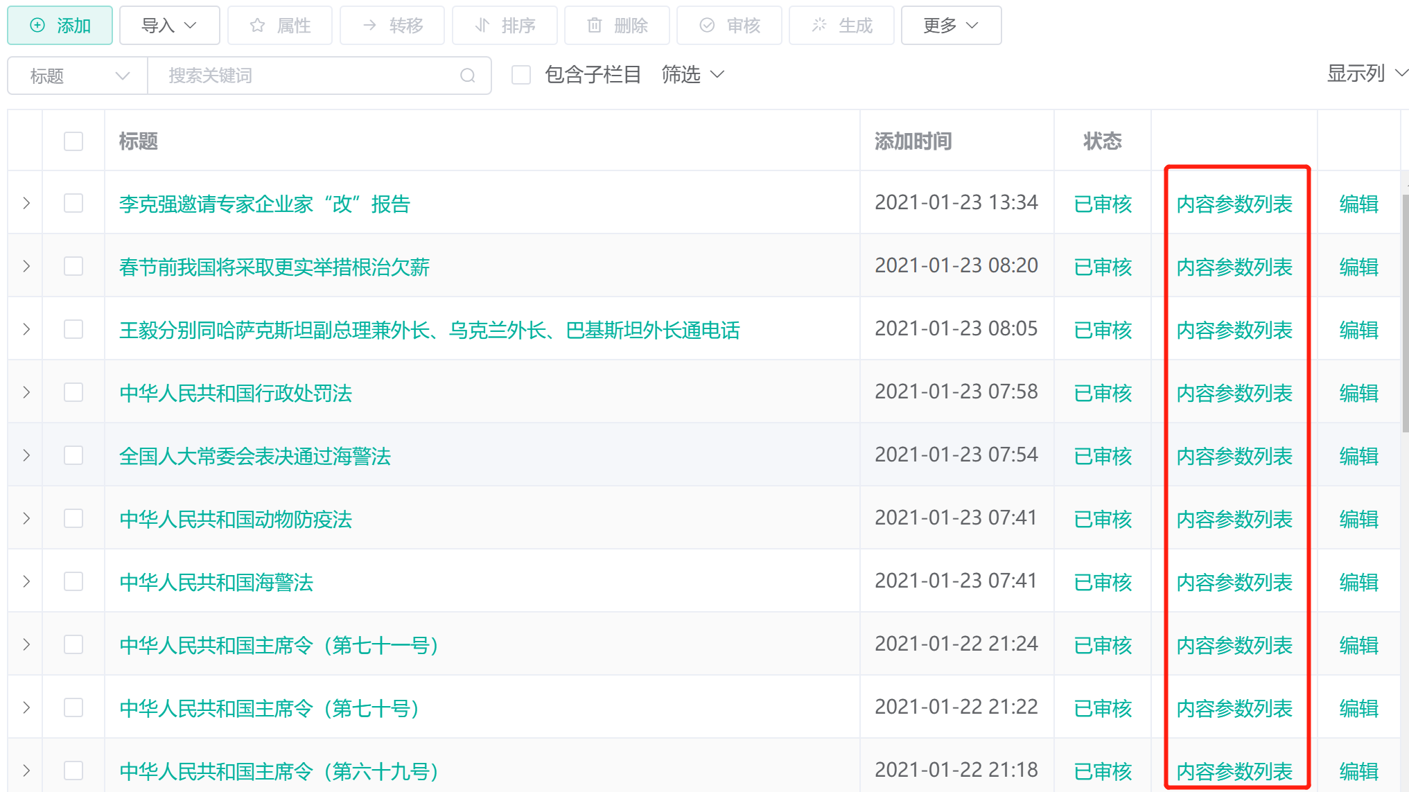开启插件后,内容列表中将出现 内容参数列表 链接: