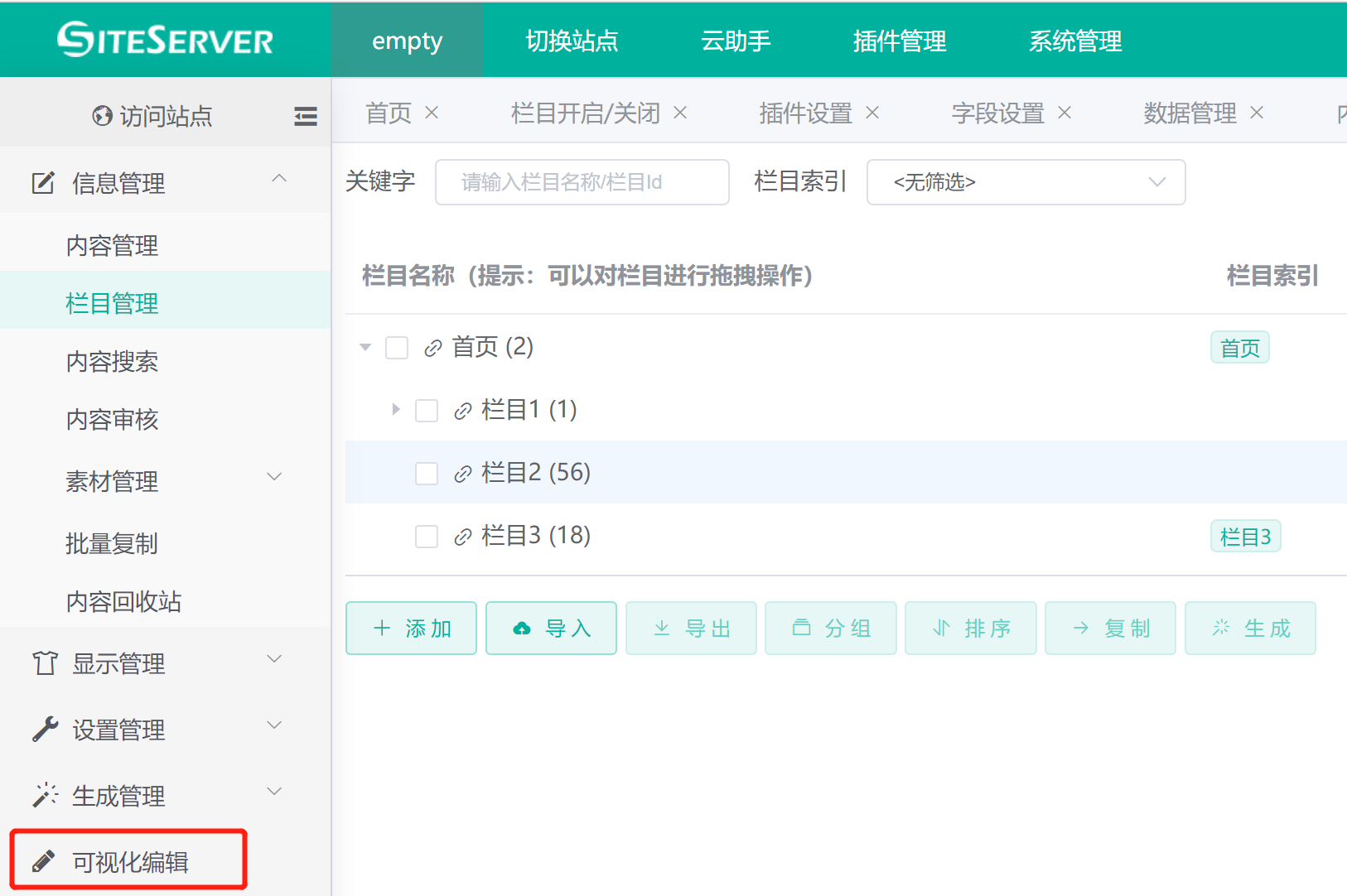 - 栏目管理界面中,双击栏目当前行弹出栏目编辑界面